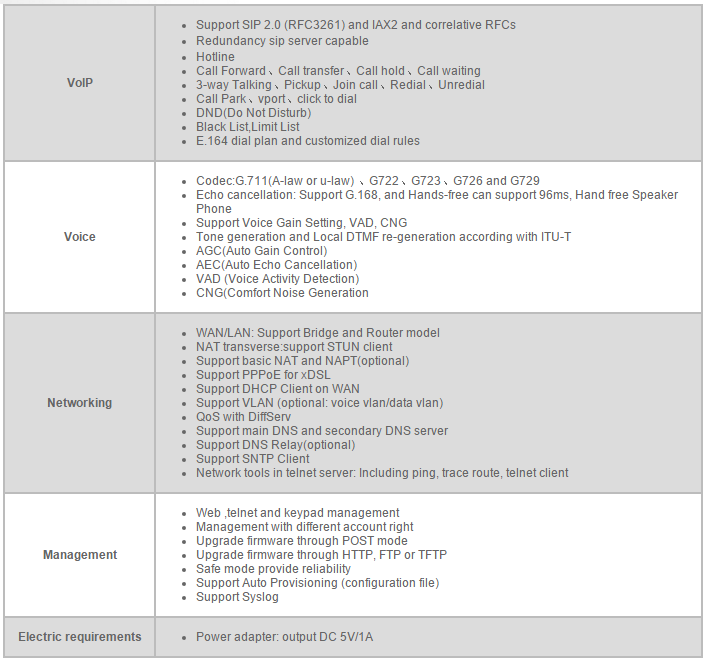 ● One RJ-11 FXS port for traditional phone set or PBX's trunk line